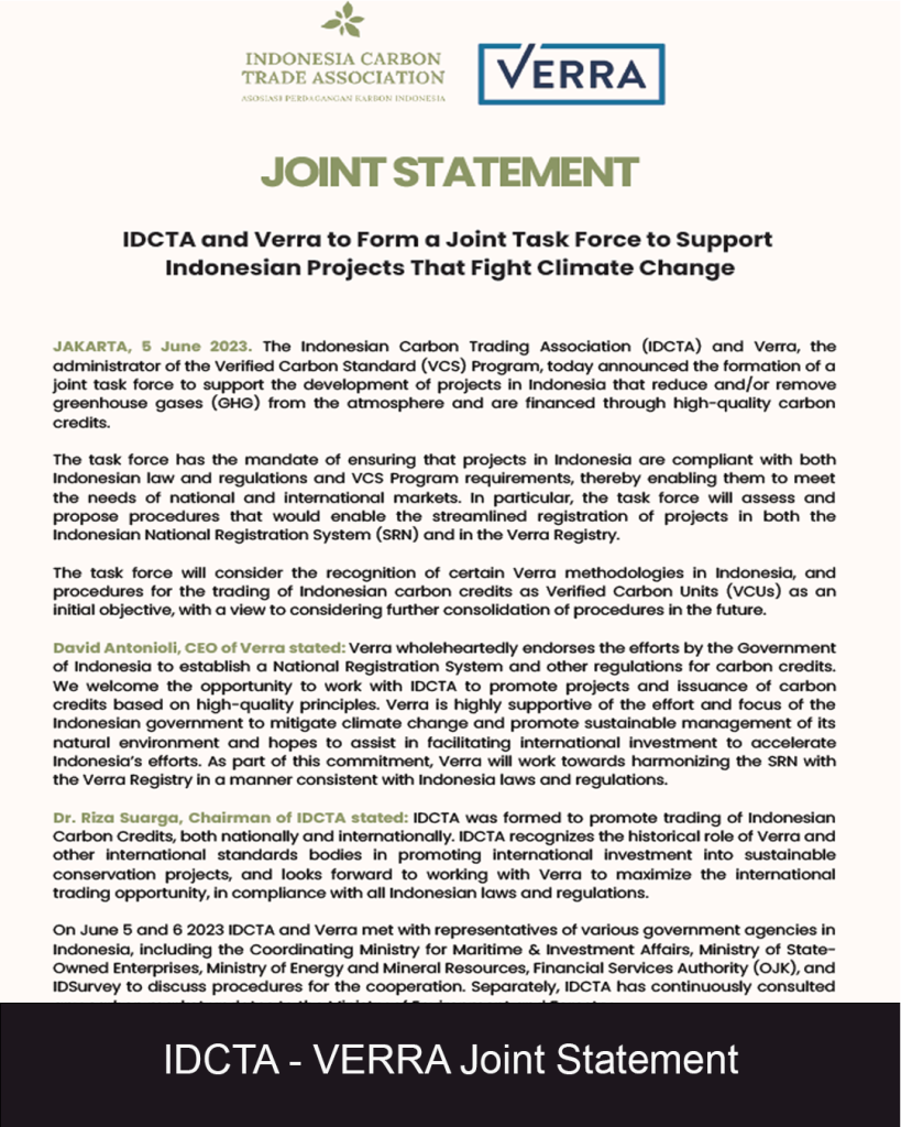 The information on this website is provided by the Indonesia Carbon Trade Association (IDCTA) for general informational purposes only and is based on data available at the time of publication. IDCTA makes no guarantees regarding its accuracy, completeness, or ongoing relevance. Any forward-looking statements or assumptions are subject to uncertainty, and actual outcomes may differ. This content does not constitute financial or investment advice. Users should seek independent professional guidance before making decisions based on this information. Some content may be sourced from third parties; IDCTA is not responsible for any errors, omissions, or misstatements. References to past performance or valuations are not indicative of future outcomes and may not reflect actual market values. This content may not be reproduced or shared without written permission from IDCTA. Accessing this site indicates your agreement to these terms. Nothing on this website constitutes an offer or solicitation to invest or trade under any jurisdiction. For inquiries, please contact the IDCTA Secretariat.